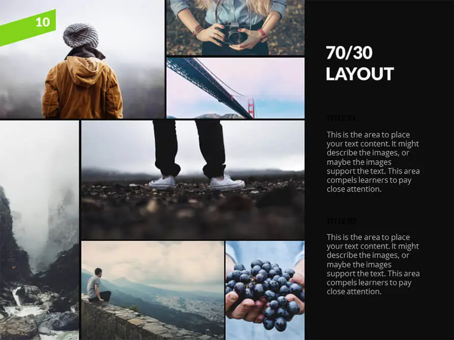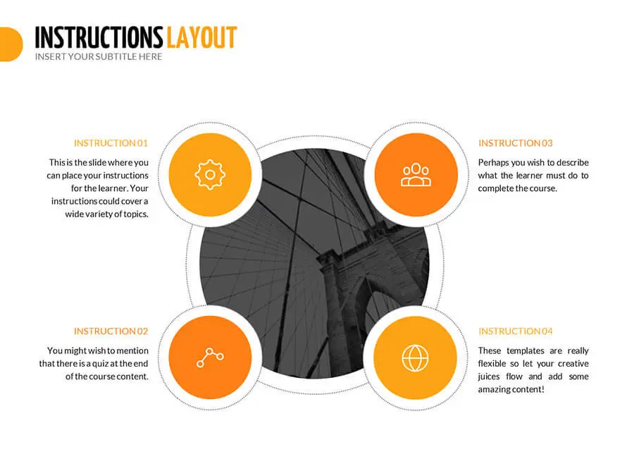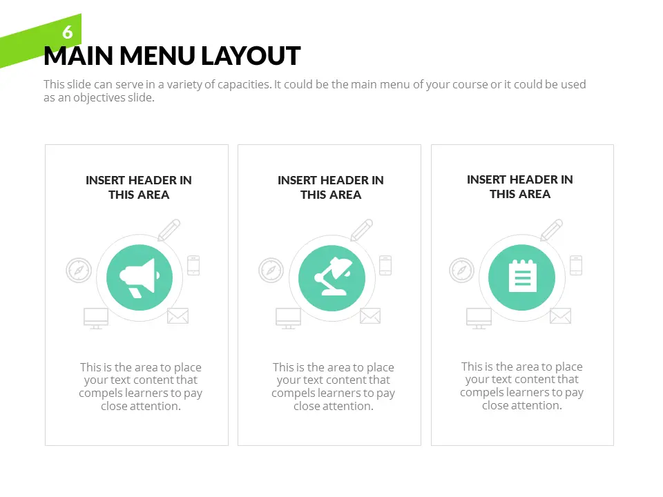 Choose from hundreds of professionally designed, ready-to-go slide templates and training assets with cohesive design and color themes. Every template is architected by the industry’s best e-learning designers, so you have all the elements you need to create an effective course.