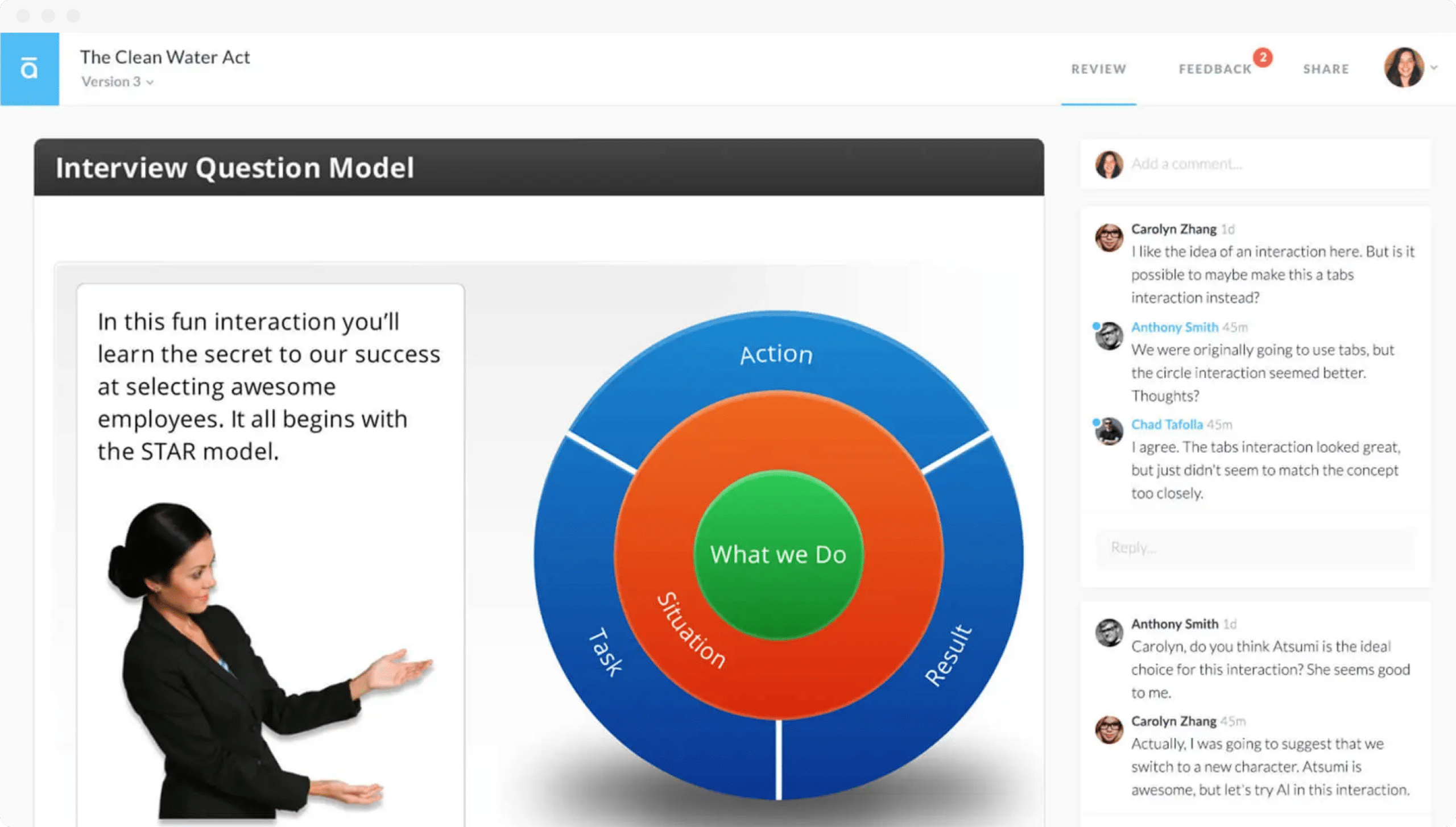 Finish projects faster with Review 360, the web‑based review app that’s part of Articulate 360. Simply upload your Engage 360 interaction to quickly gather and share feedback. Stakeholders can see the latest version, make in‑context comments, and chime in on existing threads. And you can easily view, resolve, and respond to their feedback, keeping everyone in sync.