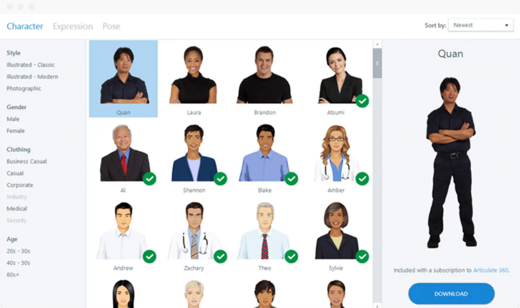 Get started quickly with high‑quality, professionally designed assets from Content Library 360 without interrupting your workflow. Fully integrated with Presenter 360, Content Library 360 includes an ever‑expanding set of relatable characters and gorgeous slide templates you can use to build pro‑looking courses faster than ever.
