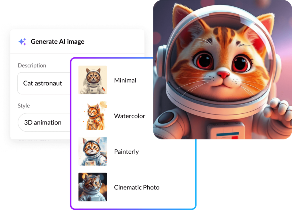 Dazzle your learners with gorgeous e-learning. Browse 13+ million course assets, or prompt AI Assistant to create custom imagery for your course. Simply use one of our prebuilt styles or create your own.