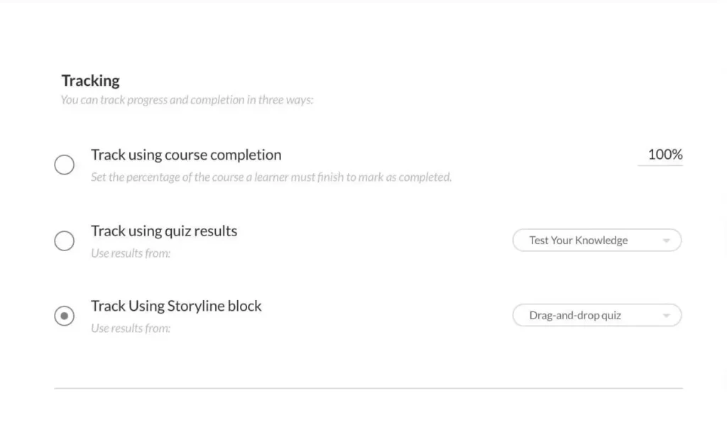 Use a Storyline block to track completion of a Rise 360 course in your LMS. Choose to track completion based on a trigger, quiz result, or number of slides viewed in your Storyline block.